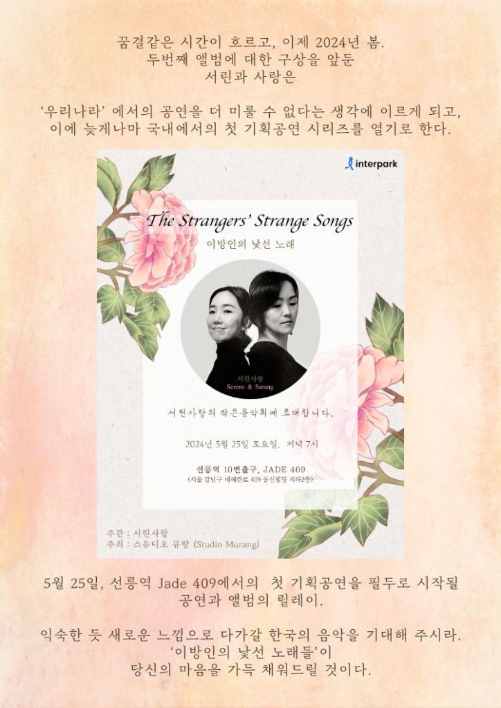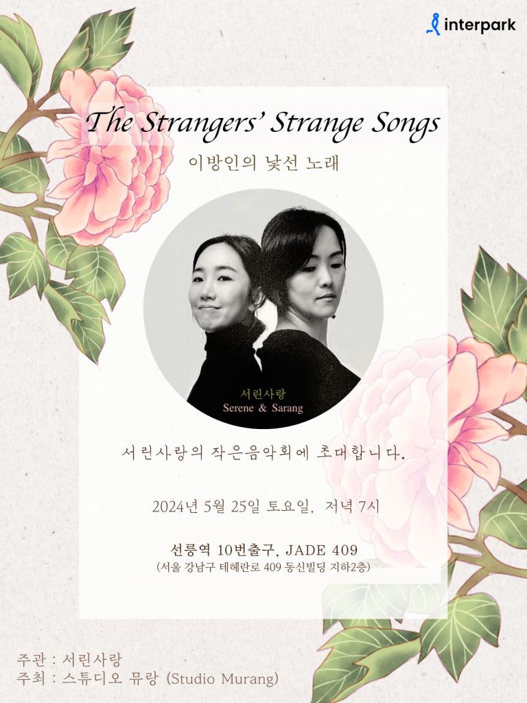 Serene & Sarang is a Korean music duo performing Korean traditional music reinvented in their own musical language. Their original songs belong to no current musical genre which is why they refer to themselves as “the strangers”.