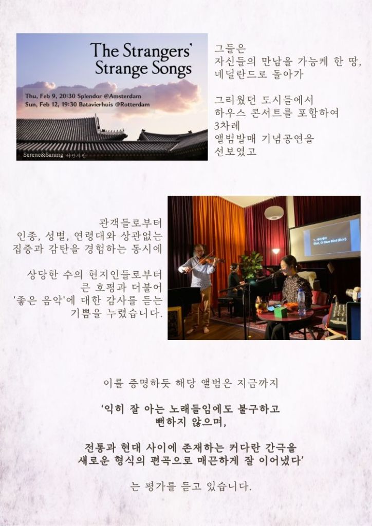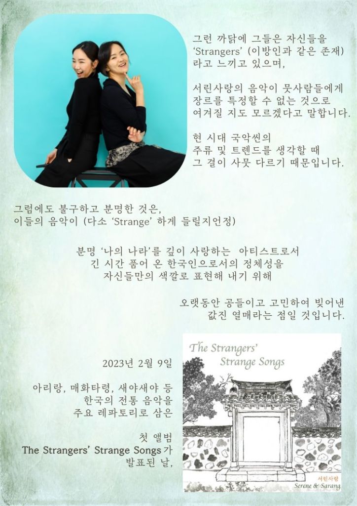Serene & Sarang is a Korean music duo performing Korean traditional music reinvented in their own musical language. Their original songs belong to no current musical genre which is why they refer to themselves as “the strangers”.