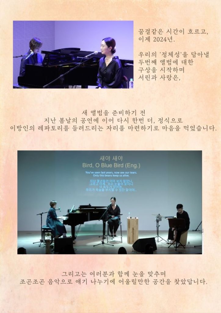 Serene & Sarang met in Holland in early 2017 and collaborated together during their time away from home. Having traveled back to Korea after their studies, after all these years, they have finally reunited in Seoul. Celebrating their first visit to The Netherlands as artists after COVID-19, the duo began their journey to showcase their new and original reinterpreted Korean ethnic music on the world stage and released their debut album on the 9th of Feb, 2023. On the day of the first album release and afterward, they performed their repertoire from their albums several times in the Netherlands and noticed that all the audiences greatly loved their music.
