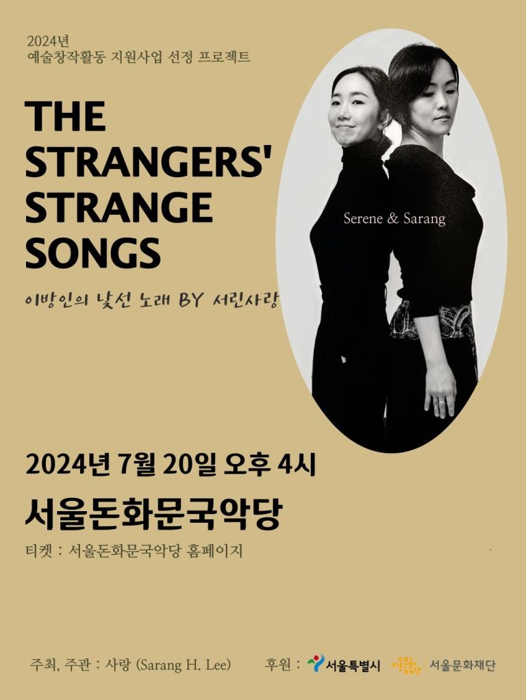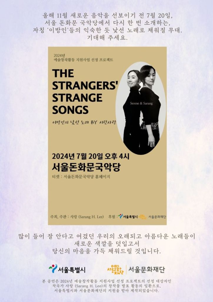 * 본 공연은 2024년 예술창작활동 지원사업 선정 대상자인작곡가 사랑 (Sarang H. Lee)의 창작 프로젝트의 일환으로,서울특별시와 서울문화재단의 지원을 받아 제작되었습니다.